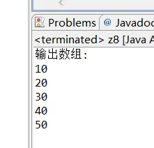 1、编写一个简单程序,要求数组长度为5,分别赋值10,20,30,40,50,在控制台输出该数组的值。(知识点:数组定义和创建、一维数组初始化)
