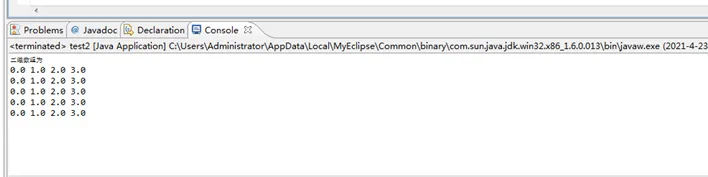 package com.zy.ktlx; public class test2 { /** * @param args */ public static void main(String[] args) { // TODO Auto-generated method stub double a[][]=new double[5][4]; for (int i = 0; i < a.length; i++) { for (int j = 0; j < a[i].length; j++) { a[i][j]=j; } } System.out.println("二维数组为"); for (int i = 0; i < a.length; i++) { for (int j = 0; j < a[i].length; j++) { System.out.print(a[i][j]+" "); } System.out.println(); } } }