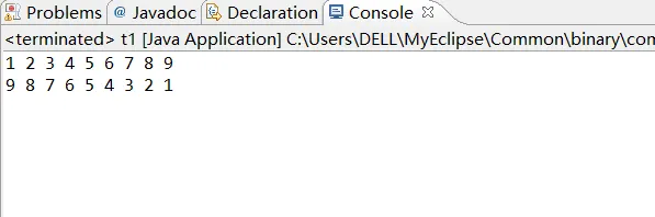 import java.util.Arrays; import java.util.Scanner; public class t1 { /** * @param args */ public static void main(String[] args) { // TODO Auto-generated method stub int []a={1,2,3,4,5,6,7,8,9}; for(int x=0;x<9;x++){ System.out.print(a[x]+" "); } System.out.println(); for (int y=8;y>=0;y--){ System.out.print(a[y]+" "); } } }