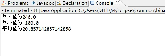 import java.util.Arrays; import java.util.Scanner; public class t1 { /** * @param args */ public static void main(String[] args) { // TODO Auto-generated method stub int a[]={-10,2,3,246,-100,0,5}; double max=a[0],min=a[0]; double sum=0,b=0; for(int x=0;x<7;x++){ sum+=a[x]; if(max<a[x]){ max=a[x]; } if(min>a[x]){ min=a[x]; } } b=sum*1.0/7; System.out.println("最大值为"+max); System.out.println("最小值为"+min); System.out.println("平均值为"+b); } }