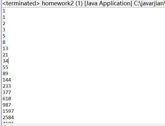 package com.dq.homework; public class homework2 { /** * @param args */ public static void main(String[] args) { // TODO Auto-generated method stub int a[]=new int[20]; a[0]=a[1]=1; for (int i = 2; i < a.length; i++) { a[i]=a[i-1]+a[i-2]; } for (int i = 0; i < a.length; i++) { System.out.println(a[i]); } } }