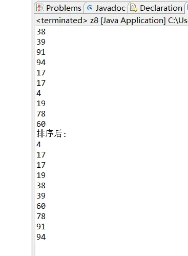 3、给定一个有9个整数(1,6,2,3,9,4,5,7,8)的数组,先排序,然后输出排序后的数组的值。(知识点:Arrays.sort排序、冒泡排序)