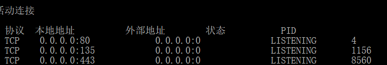 打开cmd,输入netstat -nao,查看80端口是否已经被占用。