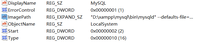 注册表找到MySQL,点击ImagePath,修改 "D:\xampp\mysql\bin\mysqld" --defaults-file="D:\xampp\mysql\bin\my.ini" MySQL (my.ini文件位置)