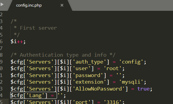 2、然后在$cfg['Lang'] ='' 后加入以下代码: $cfg['Servers'][$i]['port'] = '3316'