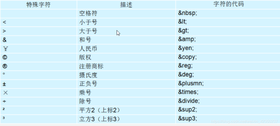 2、特殊字符:在HTML页面中,一些特殊的符号很难或者不方便直接使用,此时就用我们的特殊字符来表示。