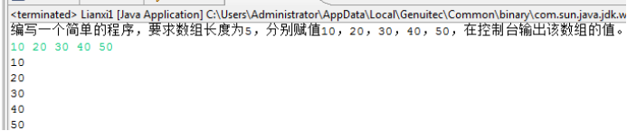 System.out.println("编写一个简单的程序,要求数组长度为5,分别赋值10,20,30,40,50,在控制台输出该数组的值。");
