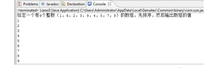 System.out.println("给定一个有9个整数(1,6,2,3,9,4,5,7,8)的数组,先排序,然后输出数组的值");