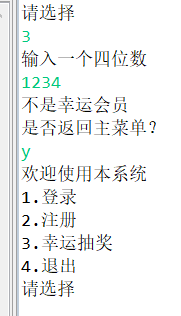 // 输入四位会员卡号,如果百位数等于随机数,幸运会员。否则不是。同时也要询问是否返回主菜单