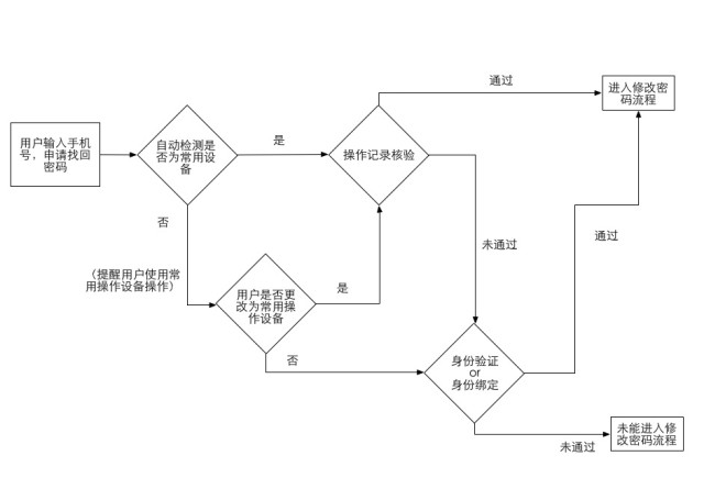 第一步,系统自动进行判断是否为常用操作设备的。若用户的设备正确,那么再进行一次操作记录核验,通过后即可进入到修改密码流程。这条线相当于通过增加“操作记录核验”的门槛来区分真用户和持有手机的小偷。