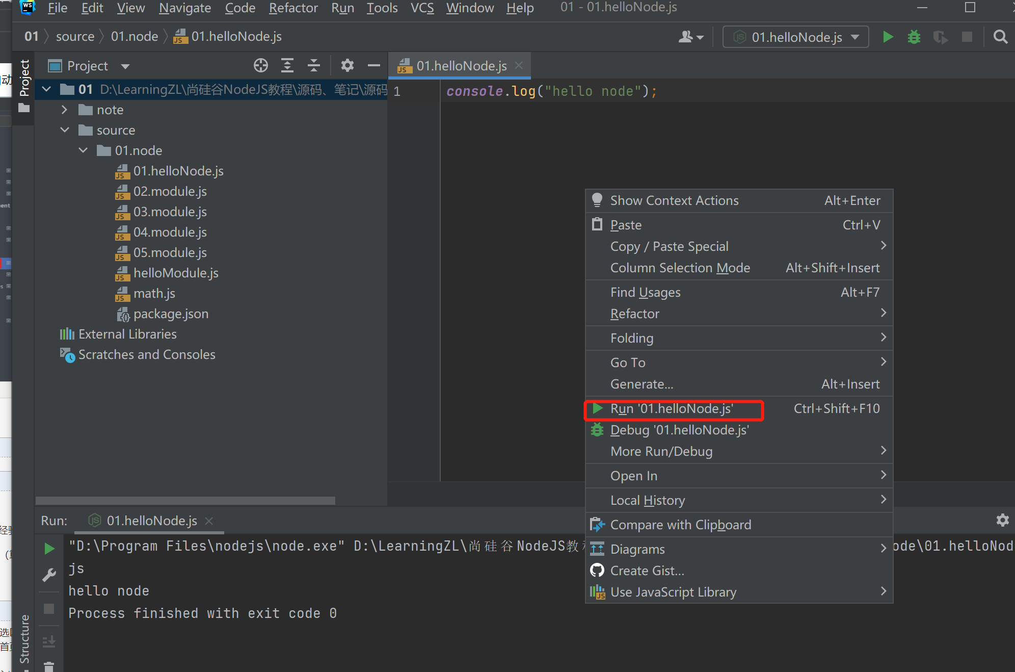 1.3配置好后就可以在工具中直接右键运行node文件;