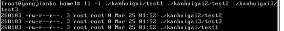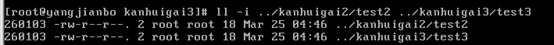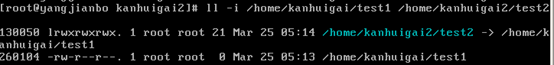 我在/home/kanhuigai创建一个文件test1,然后在/home/kanhuigai2/下面创建一个硬链接文件test2,