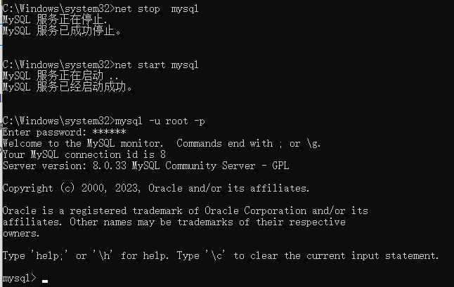 3、登录数据库(停止 + 开启 + 登录),具体指令参考 MySql 安装篇
