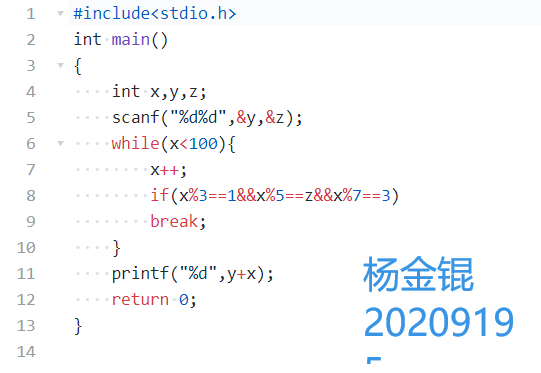 题目内容描述:妈妈给小明家新送来 y个鸡蛋。 已知小明家原有鸡蛋的个数x是满足“三个三个的数剩1个,5个5个数剩z个,7个7个数剩3个”的最小数, 请问小明家共有多少个鸡蛋? (设输入为正数,不考虑非法输入)