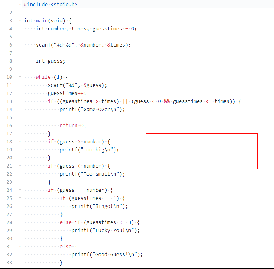 题目内容描述:猜数字游戏是令游戏机随机产生一个100以内的正整数,用户输入一个数对其进行猜测,需要你编写程序自动对其与随机产生的被猜数进行比较,并提示大了(“Too big”),还是小了(“Too small”),相等表示猜到了。如果猜到,则结束程序。程序还要求统计猜的次数,如果1次猜出该数,提示“Bingo!”;如果3次以内猜到该数,则提示“Lucky You!”;如果超过3次但是在N(>3)次以内(包括第N次)猜到该数,则提示“Good Guess!”;如果超过N次都没有猜到,则提示“Game Over”,并结束程序。如果在到达N次之前,用户输入了一个负数,也输出“Game Over”,并结束程序。