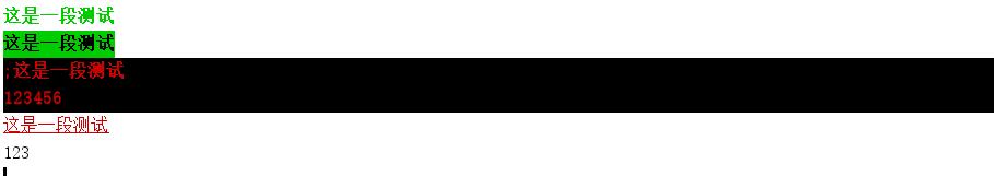 print("\033[1;32m这是一段测试\033[0m") # 1 高亮 32前景色绿色 2 print("\033[1;42m这是一段测试\033[0m") # 42背景色绿色 3 print("\033[1;31;40m;这是一段测试\n123456") # 1高亮 31 红色 41黑色背景 4 print("\033[4;31m这是一段测试\033[0m\n123") #某段内容 4下划线