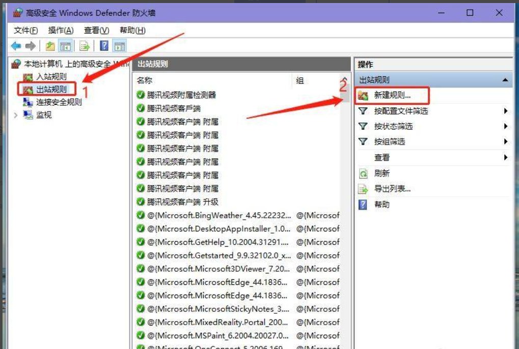 在弹出的窗口中,先点击【出站规则】,再点击窗口右侧的【新建规则】。