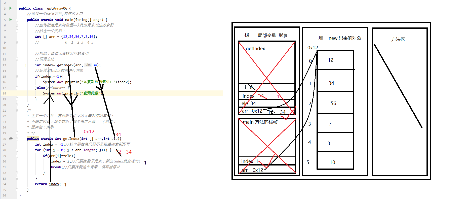 1 public class TestArray06 { 2 //这是一个main方法,程序的入口 3 public static void main(String[] args) { 4 //查询指定元素的位置--》找出元素对应的索引 5 //给定一个数组: 6 int [] arr = {12,34,56,7,3,10}; 7 // 0 1 2 3 4 5 8 9 //功能:查询元素56对应的索引 10 //调用方法 11 int index= getIndex(arr,34); 12 //后续对index的值进行判断 13 if(index!=-1){ 14 System.out.println("元素对应的索引:"+index); 15 }else{//index==-1 16 System.out.println("查无此数"); 17 } 18 } 19 /* 20 * 定义一个方法:查询数组定义的元素对应的索引: 21 * 不确定因素:那个数组,那个指定元素 (形参) 22 * 返回值:索引 23 * */ 24 public static int getIndex(int [] arr,int ele){ 25 int index = -1;//这个初始值只要不是数组的索引即可 26 for (int i = 0; i < arr.length; i++) { 27 if(arr[i]==ele){ 28 index = i;//只要找到了元素,那么index就变成为i 29 break;//只要找到这个元素,循坏就停止 30 } 31 } 32 return index; 33 } 34 }