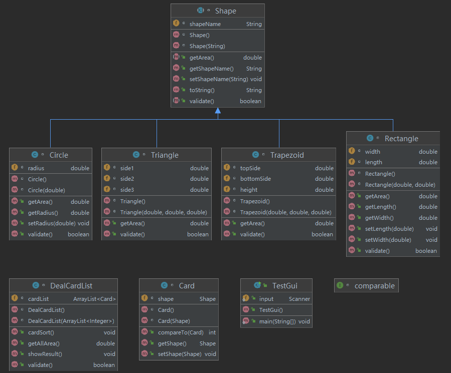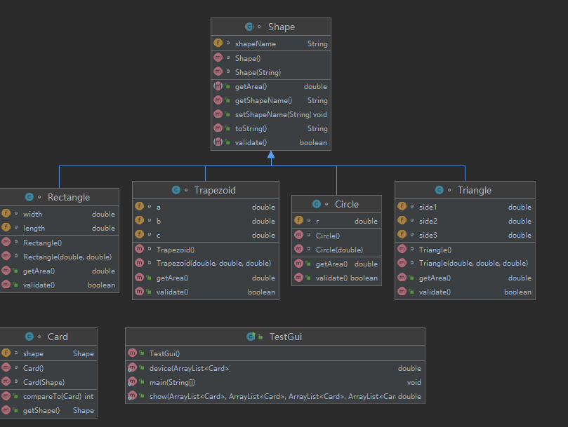 题目7-2沿袭作业 7-1,主要对卡片(Card)进行分组游戏,其规则为随机发放一些卡片给学生, 卡片仍然分为四种形状:圆形(Circle)、矩形(Rectangle)、三角形(Triangle)及梯形(Trapezoid), 并给出各种卡片的相应参数,要求学生首先根据卡片类型将所有卡片进行分组(一个类型分为一组, 所以最多四组),然后能够对每组内的卡片根据面积值从大到小进行排序,同时求出该组内所有卡片 的面积之和,最后求出每组卡片面积之和中的最大值。
