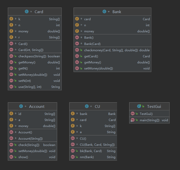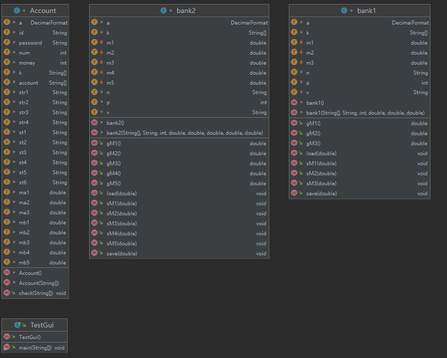 class Account{ DecimalFormat a = new DecimalFormat("0.00"); Account(){ } String id; String password="88888888"; int num,money; String[] k; String[] account; Account(String[] account) { this.account=account; } String str1="6217000010041315709"; String str2="6217000010041315715"; String str3="6217000010041315718"; String str4="6217000010051320007"; String st1="6222081502001312389"; String st2="6222081502001312390"; String st3="6222081502001312399"; String st4="6222081502001312400"; String st5="6222081502051320785"; String st6="6222081502051320786"; double ma1=10000,ma2=10000,ma3=10000,mb1=10000,mb2=10000,mb3=10000,mb4=10000,mb5=10000;