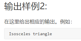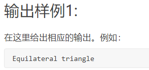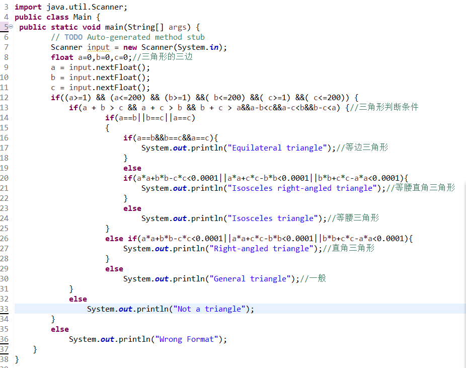 7-8(判断三角形的类型):该题要我们判断三角形的类型,要求输入三角形三边来判断该三角形为什么类型的三角形。首先拿到该题我们最先要确定三角形三边的范围([1,200]),若不符合则输出“Wrong Format”,符合才正式进行下一步的判断。我们知道判断三角形的最先决条件是“三角形任意两边之和大于第三边”以及“三角形任意两边之差小于第三边”,若不符合该条件则直接出“Not a triangle”,符合则进行下一步条件的判断。下一步则为正式判断三角形的类型了,首先进行第一步判断,若在输入的三条边中任意两条边相等的条件下每条边都相等,则该三角形为等边三角形,输出“Equilateral triangle”,若在输入三条边中任意两条边相等的情况下输入的每条边的平方相加起来结果小于0.001(约为根号二),则该三角形为等腰直角三角形,输出“Isosceles right-angled triangle”,其他情况同理,具体代码如图一: