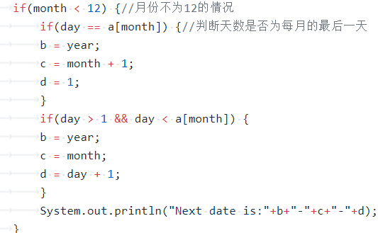 if(month == 12) {//月份为12的情况 if(day == a[month]) {//判断天数是否为每月的最后一天,天数为最后一天 b = year + 1; c = 1; d = 1; } if(day > 1 && day < a[month]) {//天数不是一个月的最后一天 b = year; c = month; d = day + 1; } System.out.println("Next date is:"+b+"-"+c+"-"+d); }