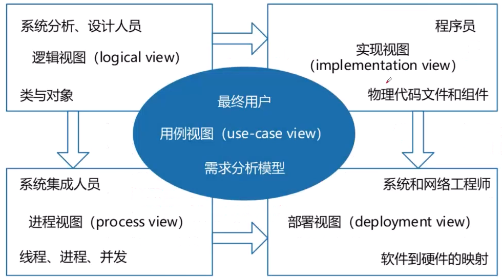- 不同角色关注不同视图,如系统分析师关注逻辑视图,程序员关注实现视图。