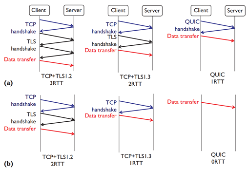 QUIC协议使用了UDP协议,不再需要这四元组参数。同时QUIC协议实现了自己的会话标记方式,称为连接UUID。当设备网络环境切换时,连接UUID不会发生变化,因此无需重新进行握手。