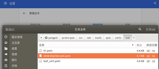 chrome://settings/certificates之后点击导入,将~/yangpei/proto-quic/src/net/tools/quic/certs/out/2048-sha256-root.pem导入,