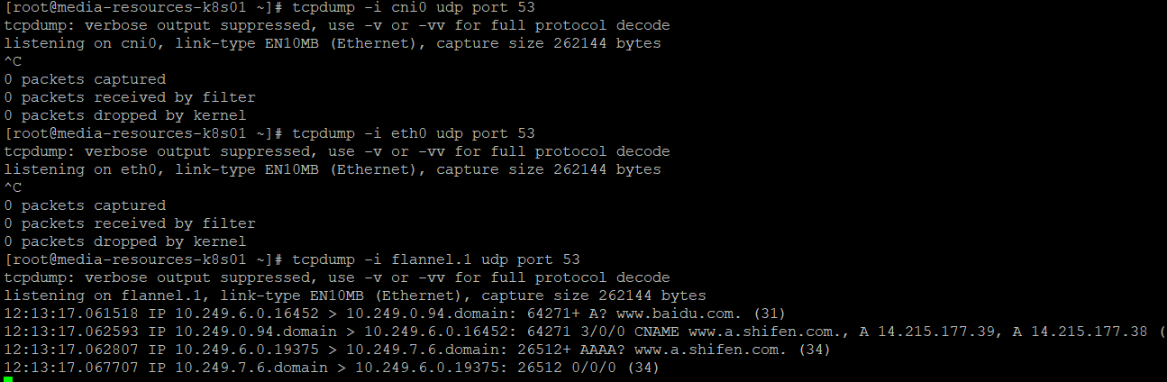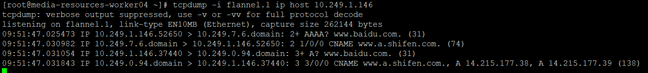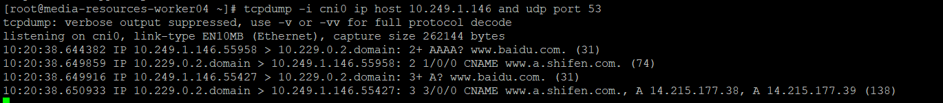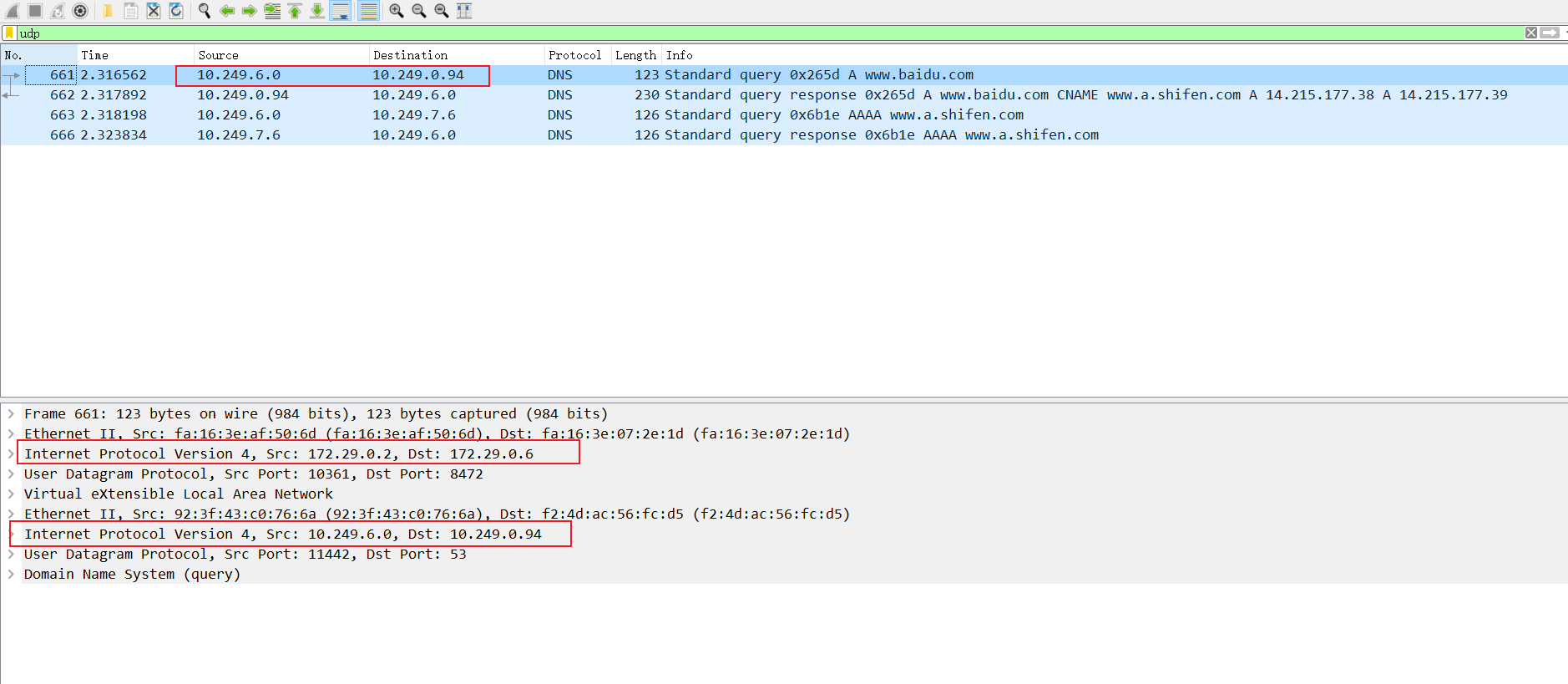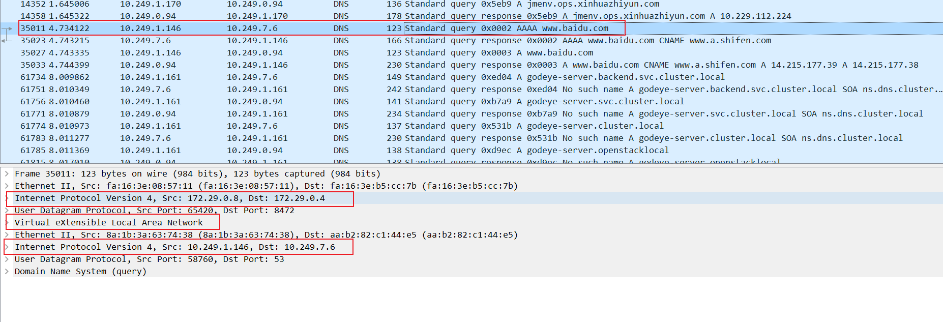 在eth0上抓的包,dns包已经被打包入 vxlan中。