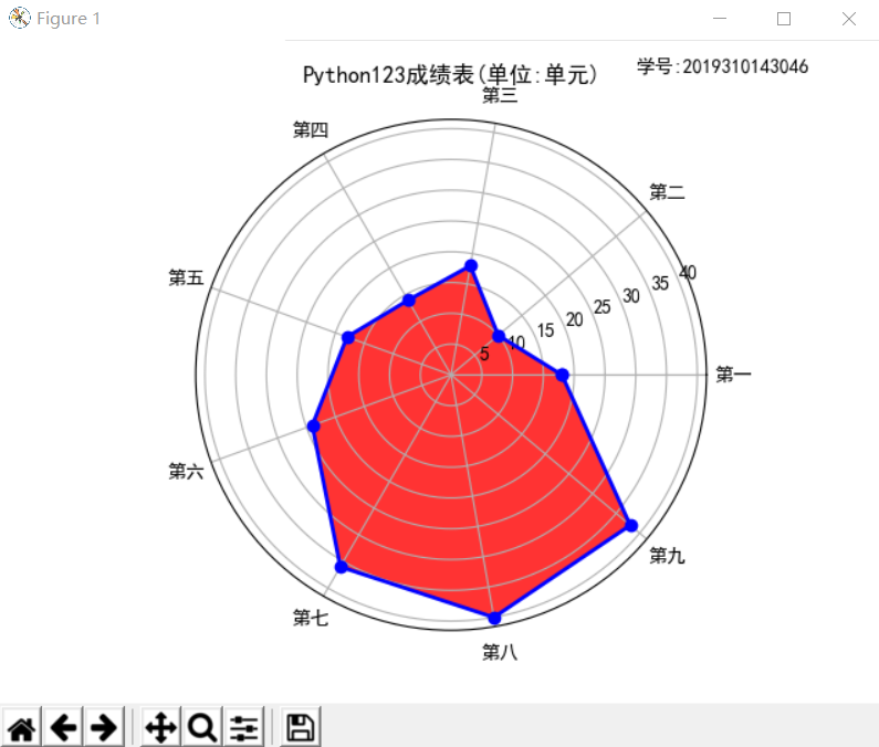 #DrawDota.py import numpy as np import matplotlib.pyplot as plt import matplotlib matplotlib.rcParams['font.family']='SimHei' matplotlib.rcParams['font.sans-serif']=['SimHei'] labels = np.array(['第一','第二','第三','第四','第五','第六','第七','第八','第九']) nAttr = 9 data = np.array([18,10,18,14,18,24,36,40,38])#数据值 angles = np.linspace(0,2*np.pi,nAttr,endpoint=False) data = np.concatenate((data,[data[0]]))#连接data和data[0] angles = np.concatenate((angles,[angles[0]]))#连接angles和angles[0] fig = plt.figure(facecolor="white")#创建一个全局绘图区域 plt.subplot(111,polar=True) plt.title('Python123成绩表(单位:单元)') plt.plot(angles,data,'bo-',color='b',linewidth=2) plt.fill(angles,data,facecolor='r',alpha=0.8) plt.thetagrids(angles*180/np.pi,labels)#在各个angles的位置上标记上对应的labels plt.figtext(0.72,0.95,'学号:2019310143046')#为全局绘图区添加文字 plt.grid(True) plt.show()