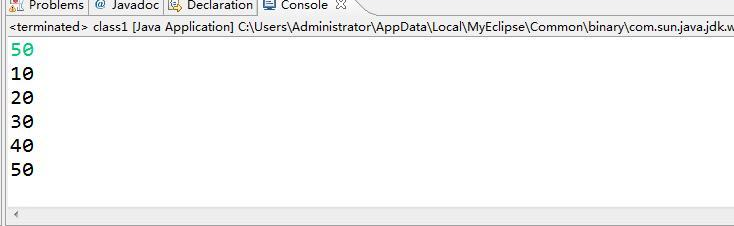 package test1; public class test1 { /** * @param args */ public static void main(String[] args) { // TODO Auto-generated method stub int []a={10,20,30,40,50}; for (int i = 0; i < a.length; i++) { System.out.println(a[i]); } } }