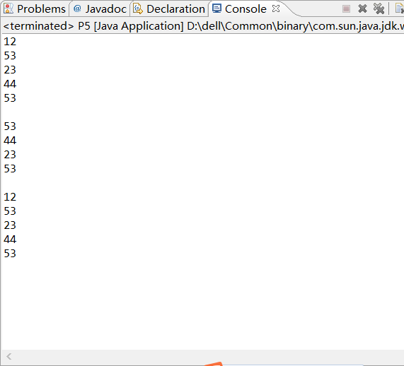 package test5; public class P5 { /** * @param args */ public static void main(String[] args) { // TODO Auto-generated method stub int a[]={12,53,23,44,53}; for (int i = 0; i < a.length; i++) { System.out.println(a[i]); }System.out.println(" "); for (int i = 4; i >0; i--) { System.out.println(a[i]); }System.out.println(" "); for(int i :a){ System.out.println(i); } } }