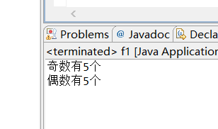 package test6; import java.util.Scanner; public class f1 { /** * @param args */ public static void main(String[] args) { // TODO Auto-generated method stub int []w={1,2,3,4,5,6,7,8,9,0}; int m=0; int y=0; for(int c=0;c<w.length;c++){ if(w[c]%2==0){ m++; }else{ y++; } } System.out.println("奇数有"+m+"个"); System.out.println("偶数有"+y+"个"); } }