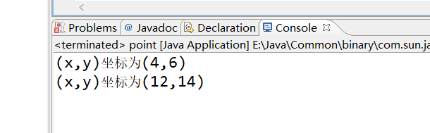 public class point { int x; int y; public point(int x0, int y0) { super(); this.x = x0; this.y = y0; } public point() { } public String movePoint(int dx,int dy){ x=x+dx; y=y+dy; return ("(x,y)坐标为"+"("+x+","+y+")"); } public static void main(String[] args) { point p1= new point(1,2); System.out.println(p1.movePoint(3, 4)); point p2= new point(5,6); System.out.println(p2.movePoint(7, 8)); } }