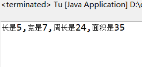 public class Tu { int length; int width; public int getArea(int length,int width){ return length*width; } public int getPer(int length,int width){ return (length+width)*2; } public void showAll(){ System.out.println("长是"+length+",宽是"+width+",周长是"+(length+width)*2+",面积是"+length*width);; } public Tu(int length,int width){ super(); this.length=length; this.width=width; } public static void main(String[] args) { // TODO Auto-generated method stub Tu r=new Tu(5,7); r.showAll(); } }