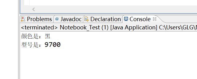 public class Notebook { char color; int model; public void color() { char color; } public void model() { int model; } public void show() { System.out.println("颜色是:"+color+"\n型号是:"+model); } } public class Notebook_Test { /** * @param args */ public static void main(String[] args) { // TODO Auto-generated method stub Notebook b1=new Notebook(); b1.color='黑'; b1.model=9700; b1.show(); } }