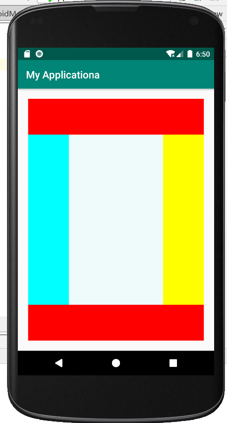 <?xml version="1.0" encoding="utf-8"?> <RelativeLayout xmlns:android="http://schemas.android.com/apk/res/android" android:layout_width="match_parent" android:layout_height="match_parent" android:background="#EFFBFB" android:layout_margin="20dp" android:orientation="horizontal"> <View android:id="@+id/v_1" android:layout_width="match_parent" android:layout_height="70dp" android:background="#FF0000" android:layout_alignParentTop="true"/> <View android:id="@+id/v_2" android:layout_width="match_parent" android:layout_height="70dp" android:background="#FF0000" android:layout_alignParentBottom="true"/> <View android:id="@+id/v_3" android:layout_width="80dp" android:layout_height="551dp" android:layout_below="@+id/v_1" android:layout_above="@+id/v_2" android:layout_alignParentLeft="true" android:background="#00FFFF" /> <View android:id="@+id/v_4" android:layout_width="80dp" android:layout_height="551dp" android:layout_below="@+id/v_1" android:layout_above="@+id/v_2" android:layout_alignParentRight="true" android:background="#FFFF00" /> </RelativeLayout>