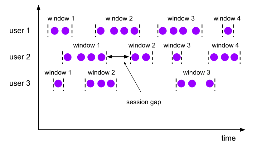 相反,当会话窗口在特定时间段内没有接收到元素时,即,当发生不活动间隙时,会话窗口将关闭。
