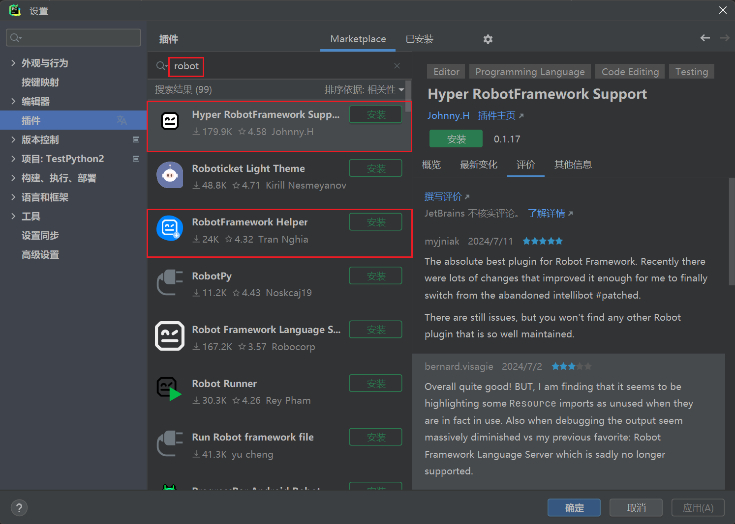 安装插件:File --> Settings --> Plugins --> 搜索 robot,并安装(如下图任意一个即可) --> 重启 pycharm
