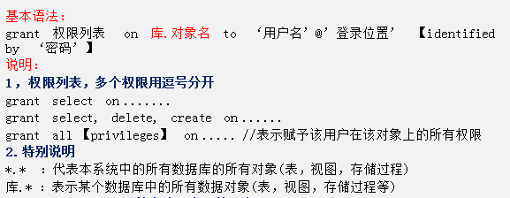 grant 权限列表 on 库.对象名 to '用户名'@'主机名' [identified by '密码']