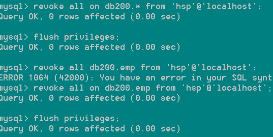 revoke 权限列表 on 库.对象名 from '用户名"@"登录位置';