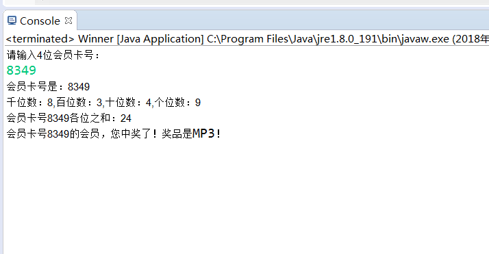 用户输入一个4位会员卡号,若四位会员卡号数字之和大于20,则中奖。