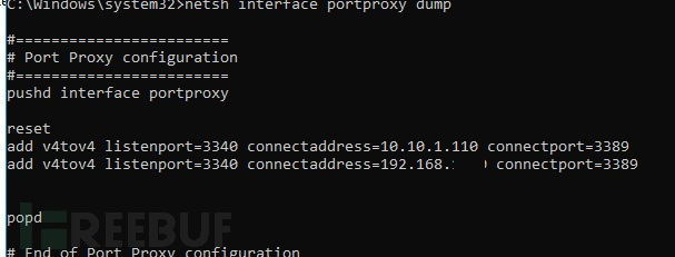 netsh interface portproxy dump #======================== # Port Proxy configuration #======================== pushd interface portproxy reset add v4tov4 listenport=3340 connectaddress=10.1.1.110 connectport=3389 popd # End of Port Proxy configuration