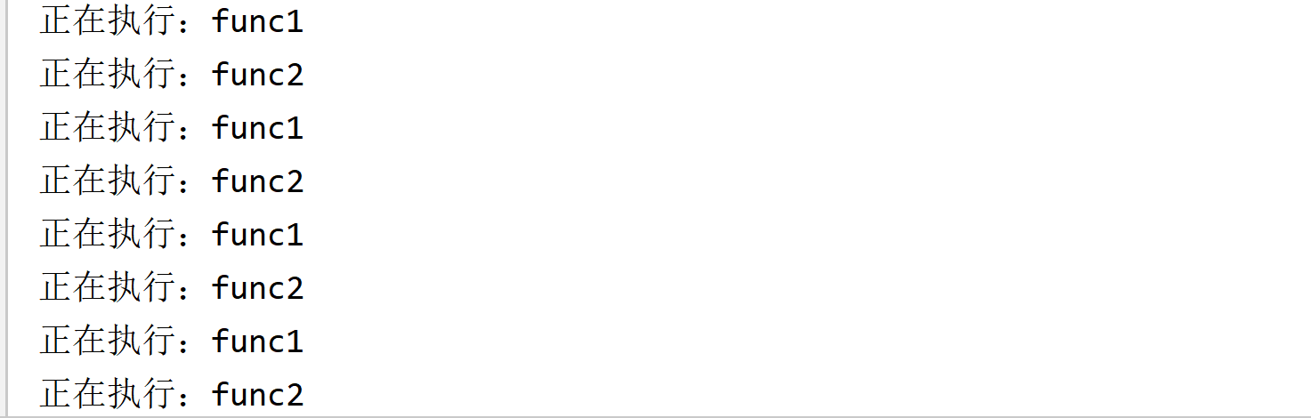 import time def func1(): while True: print('正在执行:func1') yield time.sleep(2) def func2(): while True: print('正在执行:func2') yield time.sleep(2) if __name__ == '__main__': for i in range(5): next(func1()) next(func2())