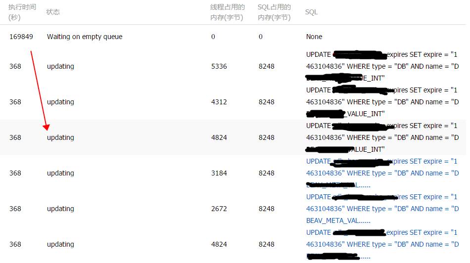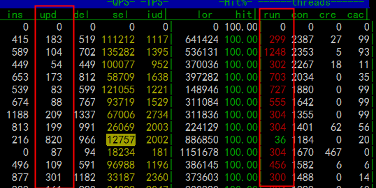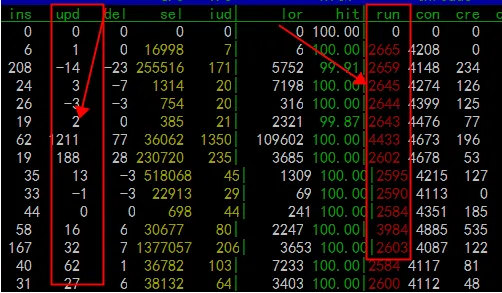 可以看到数据库中的活跃连接数非常高,每秒的update非常不稳定。