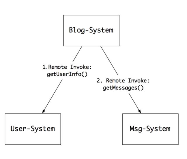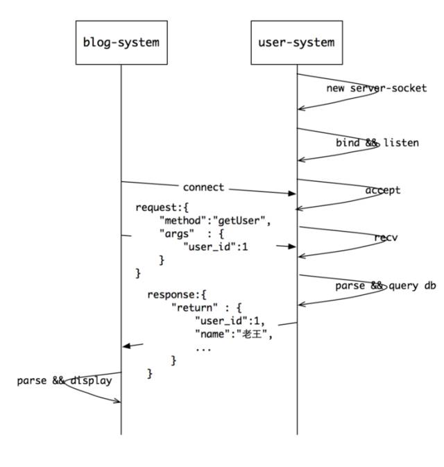 比方说,我们现在有两个系统(可能不在同一台机器上的两个进程),要交换用户信息:一方是逻辑系统(比方叫blog-system),接收用户提交的user_id,这个系统想用user_id获取用户的详细信息,并展示给用户;另一方是用户系统(比方叫user-system),存储了用户所有的数据(比如:name、nickname、email等等),可以提供根据user_id获取用户详细信息的数据。那我们可以怎么做呢?很简单,我们可以有很多做法,最简单的一种: