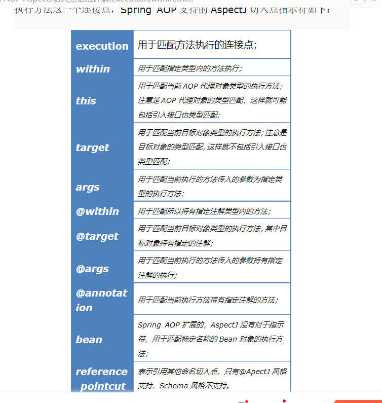 1 <?xml version="1.0" encoding="UTF-8"?> 2 <beans xmlns="http://www.springframework.org/schema/beans" 3 xmlns:xsi="http://www.w3.org/2001/XMLSchema-instance" 4 xmlns:aop="http://www.springframework.org/schema/aop" 5 xsi:schemaLocation="http://www.springframework.org/schema/beans http://www.springframework.org/schema/beans/spring-beans.xsd 6 http://www.springframework.org/schema/aop http://www.springframework.org/schema/aop/spring-aop.xsd"> 7 8 <bean id="myMethodInterceptor" class="com.example.docker.aop.MyMethodInterceptor"/> // 注入自定义的interceptor 9 10 11 <aop:config> 12 <!--<aop:advisor pointcut="execution(* com.example.docker.service.impl.*.*(..))" advice-ref="myMethodInterceptor" />--> 13 14 <!--<aop:advisor pointcut="@within(com.example.docker.annotation.TraceLog)" advice-ref="myMethodInterceptor" />--> 15 16 <aop:advisor pointcut="@annotation(com.example.docker.annotation.TraceLog)" advice-ref="myMethodInterceptor" /> // within 和 @within 的区别,后者时对于注解来说的。 @within 和 @anntation区别 后者是方法级别,前者为类级别 17 18 </aop:config> 19 </beans>