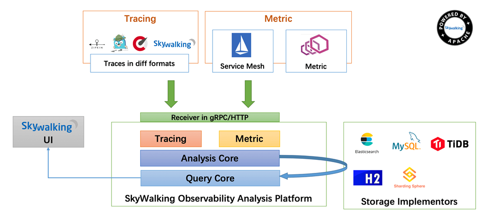 说明:SkyWalking 的核心是数据分析和度量结果的存储平台,通过 HTTP 或 gRPC 方式向 SkyWalking Collecter提交分析和度量数据,SkyWalking Collecter 对数据进行分析和聚合,存储到 Elasticsearch、H2、MySQL、TiDB 等其一即可,最后可以通过 SkyWalking UI 的可视化界面对最终的结果进行查看。Skywalking 支持从多个来源和多种格式收集数据:多种语言的 Skywalking Agent 、Zipkin v1/v2 、Istio 勘测、Envoy 度量等数据格式。