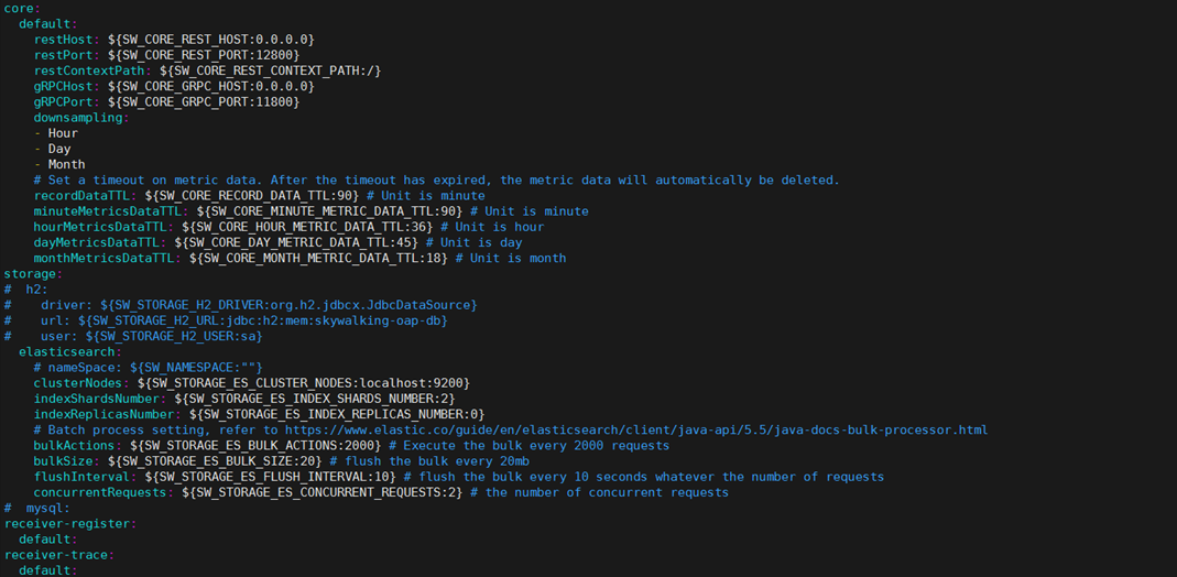 修改config/application.yml 的默认数据存储开启是的 h2,这里我们需要修改数据存储为 Elasticsearch(在启动 SkyWalking 之前,确保 Elasticsearch 已启动)